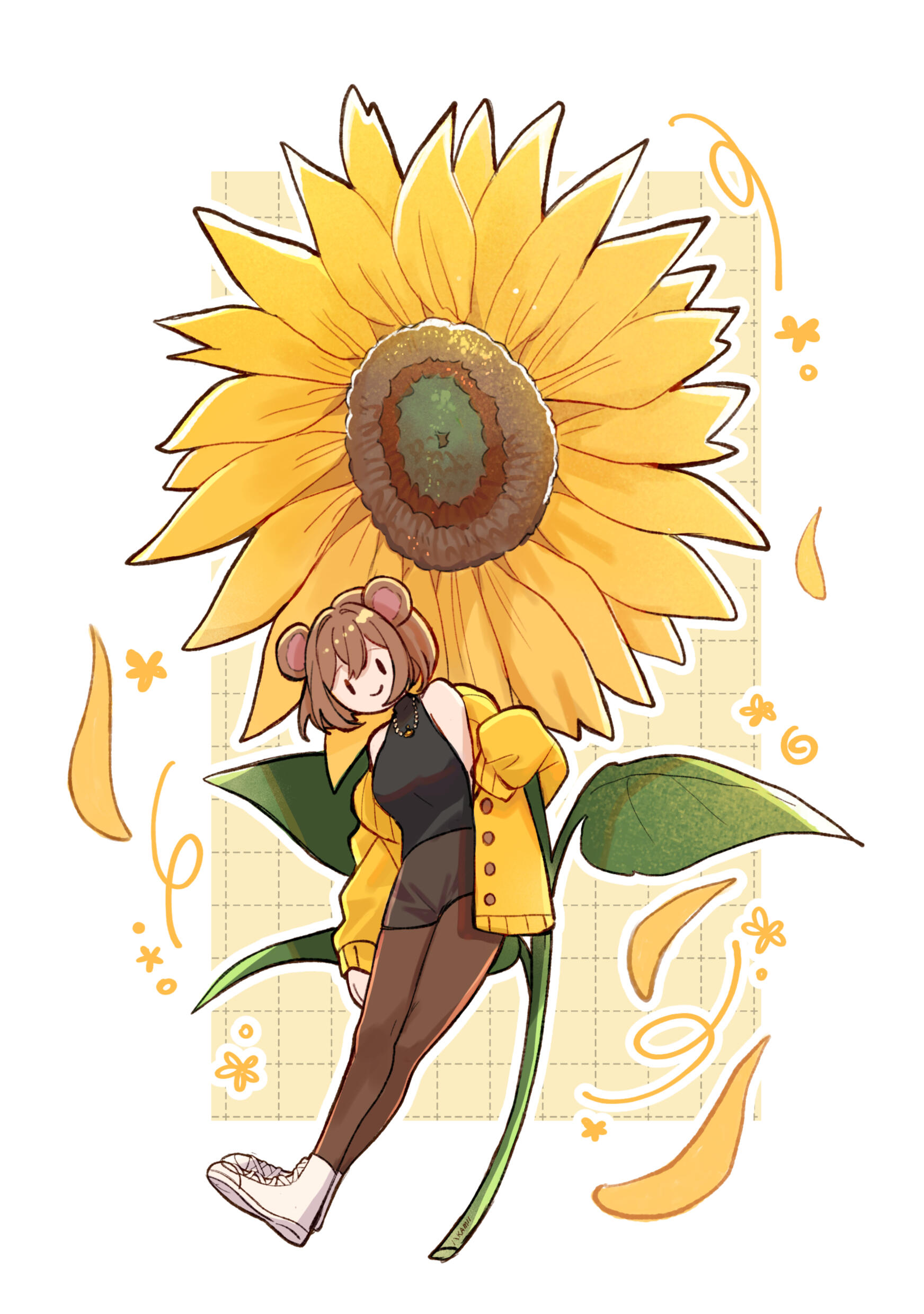 ㅤ✦.── Abeari'sㅤ outfit revolves around a warm shade of yellow reminiscent of the sunflowers she's grown to love so much. she wears a black knit sleeveless turtle neck, a black mini skirt, and semi-opaque black tights with off-white high top converse. her cardigan is a sunflower yellow that is a bit oversized & loose but ultra comfy with brown buttons and pockets! a very fashionable teddy bear as you can see!